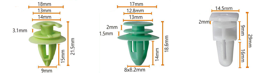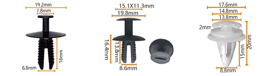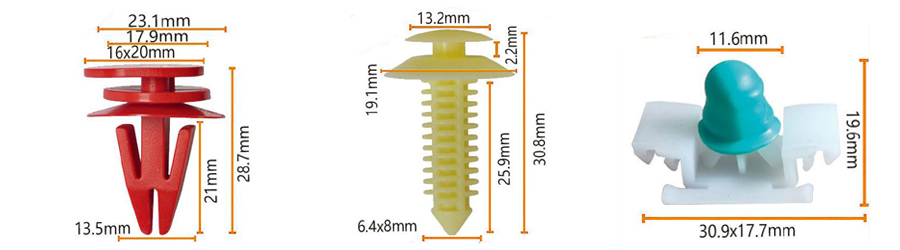PLASTIC RACK RELEATT CLIPS: Brukes til å fikse kroppspaneler, støtfangere, hjulbueforinger og så videre. Disse klippene er vanligvis laget av høye temperaturbestandig plast med høy styrke og er designet med en rask utgivelsesfunksjon, noe som gjør det enkelt å reparere eller erstatte deler.