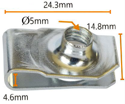 Fasten har presise totale dimensjoner, og måler 24,3 mm i bredden og 14,8 mm i høyden, og sikrer en sømløs passform med festepunkter på bilen din. I tillegg kan den 4,6 mm lengden som er nevnt nederst på bildet, referere til en kritisk dimensjon av en spesifikk del, og ytterligere understreke produktets profesjonalitet og presisjon.